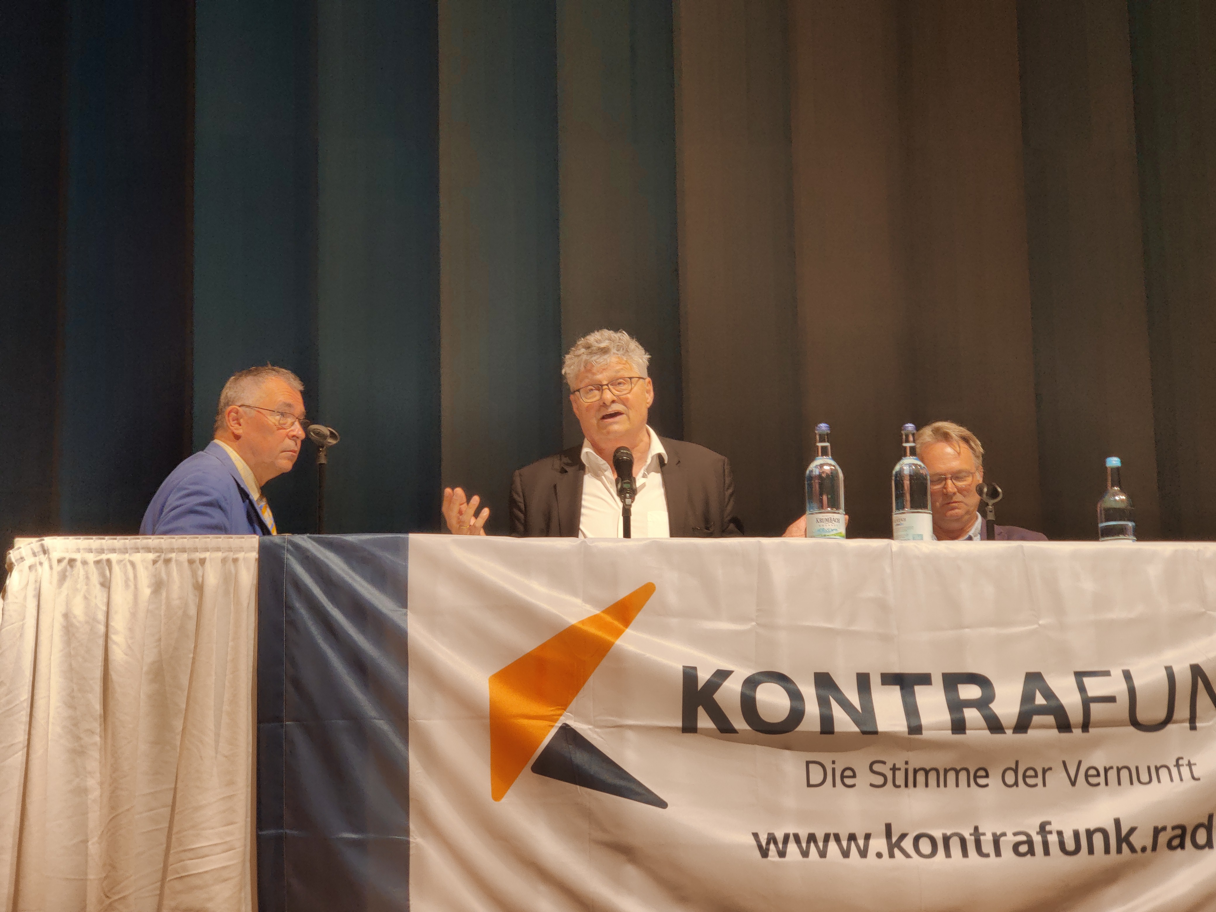 Zum Abschluss der Geburtstagsfeier holte Burkhard Müller-Ullrich die Mannschaft des Kontrafunks auf die Bühne. Er verlieh den Stimmen aus dem Radiosender ein Gesicht und plauderte mit den Akteuren ein bisschen aus dem Alltagsgeschäft des Senders. Wichtig ist dem Kontrafunk, dass der Urgedanke des Journalismus (tolerant, offen, fair) zum Tragen kommt, wodurch ein Qualitätsprodukt entsteht, welches aus dem Einheitsbrei der Systemmedien herausragt.