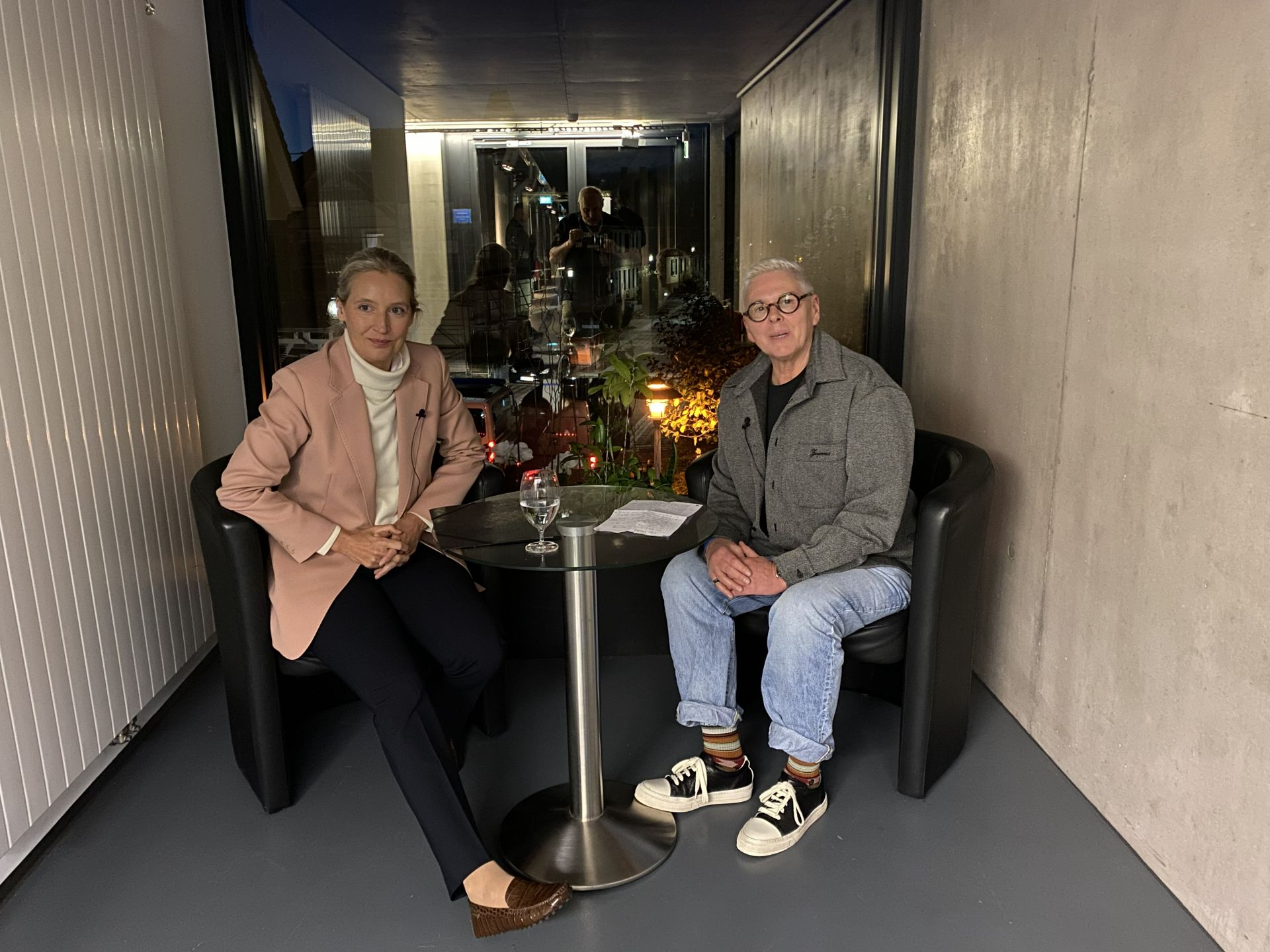 Ich muss diesen blöden Satz mit den Schalentieren aus meinem Kopf kriegen. Jetzt. Denn jetzt ist SIE da. Alice Weidel. Nur Zeit für ein schnelles, atemloses ”Hallo”. Adrenalin. Mikrophone an. Auf die Sessel, fertig los. Das geht übrigens nur mit einem Medienprofi wie Weidel. Ohne nochmal irgendwas probeweise zu checken sind wir alle vier, einer hinter der Kamera, zwei davor und einer im Körbchen jetzt im Interview.