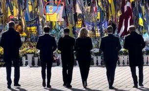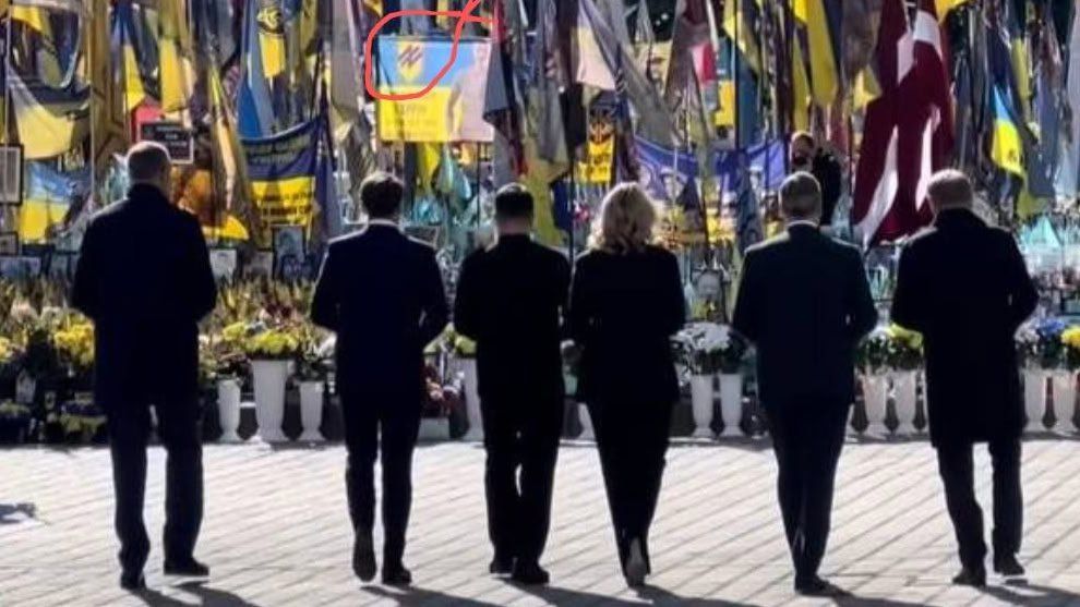 Das ist für Europäische Politiker, die das "Nie wieder" von Kindheitsbeinen inhaliert haben, aber kein Problem. Beim historischen Besuch der "Coalition of the Willing" am 10. Mai 2025 auf dem Maidan, der das Ziel hat, die Unterstützung für einen Waffenstillstand und Gedenken an Kriegsopfer deutlich zu machen, findet man nicht nur, aber auch, Bundeskanzler Merz auf einem Bild mit der Wolfsangel.