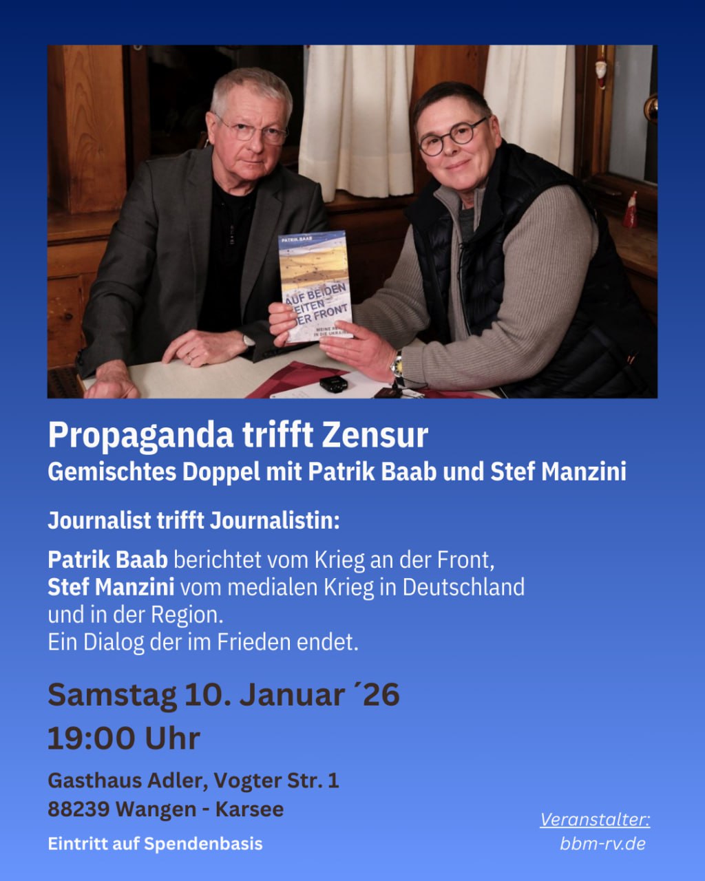 Die Organisation ”bbm-rv.de”, Bürger-Bauern-Mittelstand Ravensburg lädt die beiden Journalisten am Samstag, dem 10. Januar 2026, um 19 Uhr in den Adler nach Wangen-Karsee ein, einem Leuchtturm für freiheitlichen Dialog im Allgäu. Der Eintritt ist frei, zur Kostendeckung wird um eine Spende von plus/minus 15 Euro gebeten, die empfehlenswerte Küche des Adlers sei ab 16 Uhr geöffnet, schreiben die Veranstalter auf ihrem Einladungsflyer.