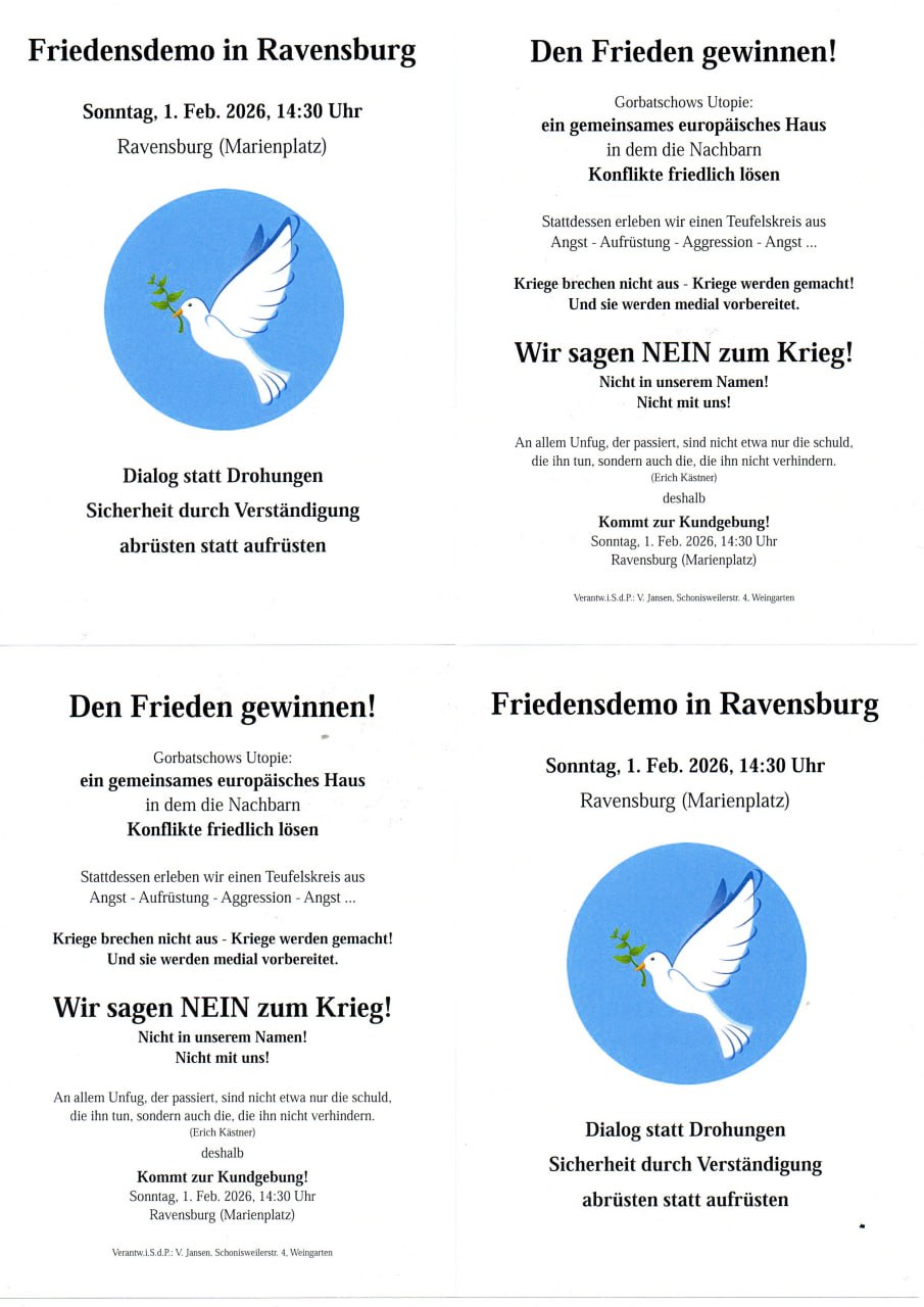 Am kommenden Sonntag, dem 1. Februar 2026, findet ab 14.30 Uhr auf dem Marienplatz in Ravensburg eine “Friedensdemo” statt. Das Organisationsteam um den pensionierten Lehrer Volker Jansen bittet recht herzlich um zahlreiche Teilnahme. Immer wieder ruft auch stattzeitung.org dazu auf, aktiv zu werden und sich für Frieden in Europa einzusetzen. Die Kriegsrhetorik vieler Politiker, wiedergegeben in den Mainstreammedien, scheinen uns alle auf einen bevorstehenden Krieg mit Russland einzuschwören und regelrecht vorbereiten zu wollen. Es gilt im ganzen Land dagegen zu protestieren, und Wege aus der Aufrüstungsspirale aufzuzeigen. Die Menschen wollen Frieden. Das muss nach außen hin im Stadtbild sichtbar gemacht werden. In diesem Zusammenhang weisen wir auf die große Friedensdemo am 14. Februar in München hin. Jetzt aber können wir alle gemeinsam in Ravensburg ein Zeichen für Entspannungspolitik und Diplomatie setzen. Stef Manzini von stattzeitung.org wird in Ravensburg vor Ort sein, und einen Redebeitrag zu dieser Veranstaltung leisten. Wir sehen uns alle in Ravensburg!